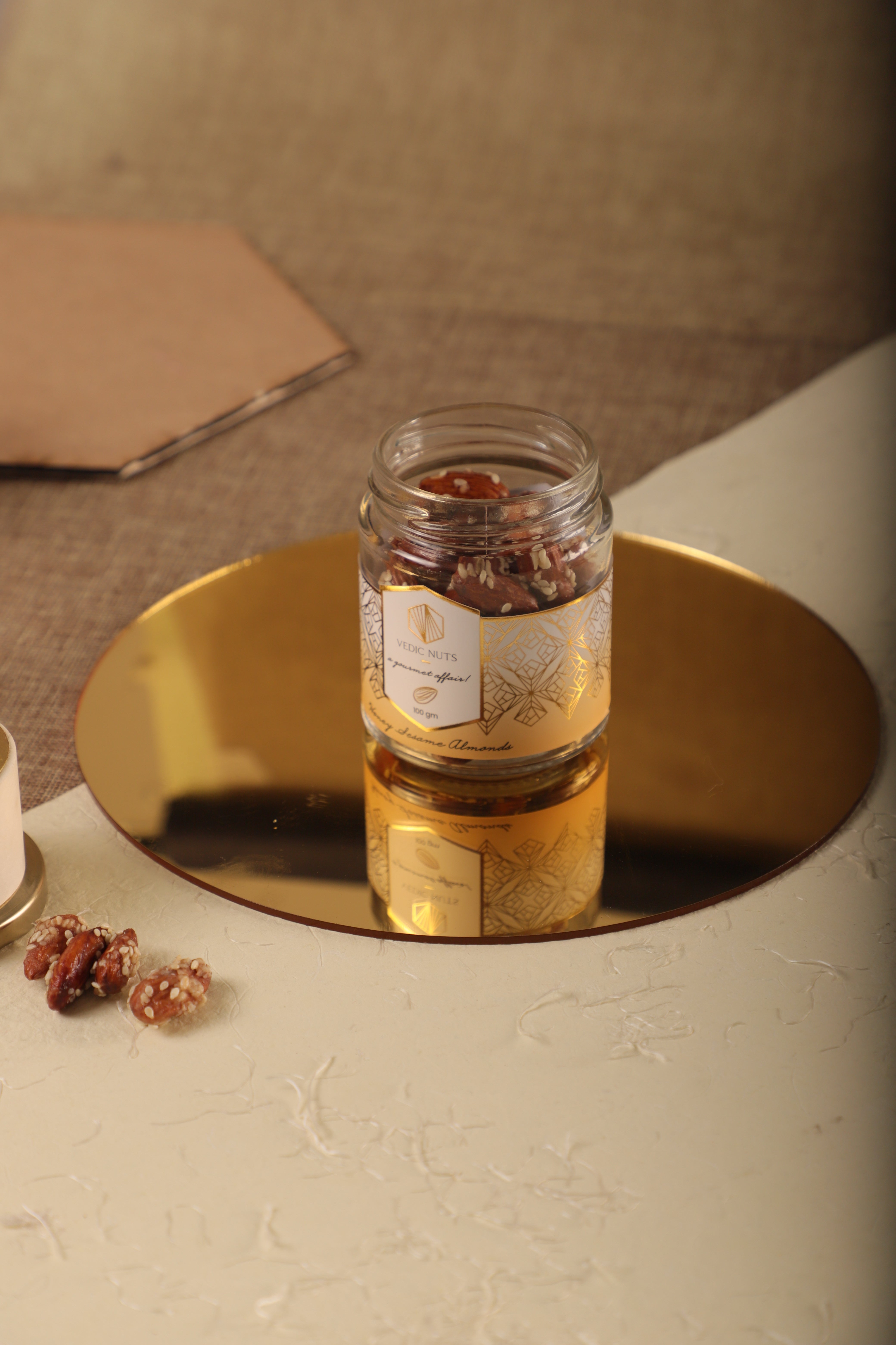 Subtle flavours, sweet, crunchy and healthy. Honey Sesame almonds are a versatile treat, perfect for snacking on their own or as a topping for desserts and baked goods. No sugar or preservatives, these Honey sesame almonds are the perfect substitute to your dessert cravings.