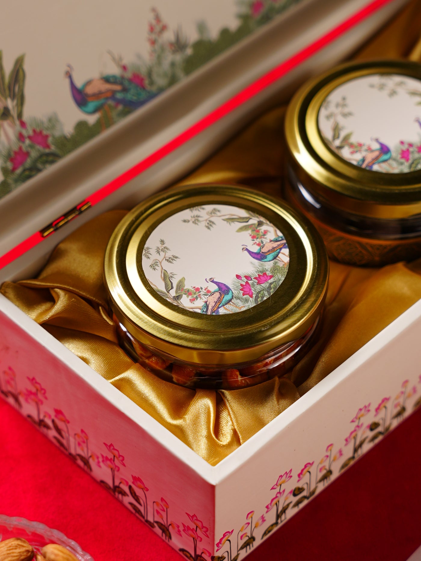 • 🥜 3 Premium Nuts Jars (200g each): Rose petal almonds, Vedic Gourmet Mix, Mint-Dusted Cashews
