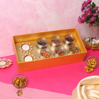 • 🥜 6 Premium Nut Jars (50g each): Rose Petal Almonds, Mint Dusted Cashews, Vedic Gourmet Mix & Trail Mix, Chocolate hazelnut & Kala khatta raisin